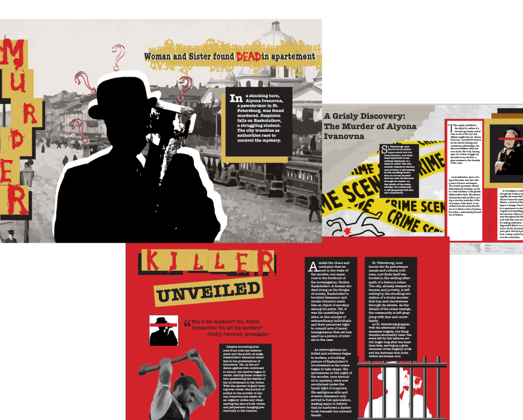 When designing a magazine feature article for Crime and Punishment, I wanted to approach it from a whodunnit angle that would immediately draw readers in with a sense of mystery and suspense. The challenge was to capture the psychological tension of the novel while focusing on the crime at its core. I imagined the ad starting with an abstract representation of the murderer, with a silhouette of a man holding an axe, suggesting something sinister has occurred. For the typography, I chose bold, and bloody fonts to evoke the urgency and tension of a detective story, and paired it with the title of “Murder” to spark curiosity. I kept the color palette dark and moody to reflect the book’s grim tone, using shadows and contrasts to create a sense of unease and uncertainty, much like the inner turmoil of Raskolnikov himself. However, I also included the color yellow because of it’s gratuitous use in the book. The goal was to hint at the psychological unraveling of the protagonist, creating a visual narrative that would draw readers in and make them want to uncover the truth behind the crime, all the while conveying information in a way that was aesthetically pleasing.